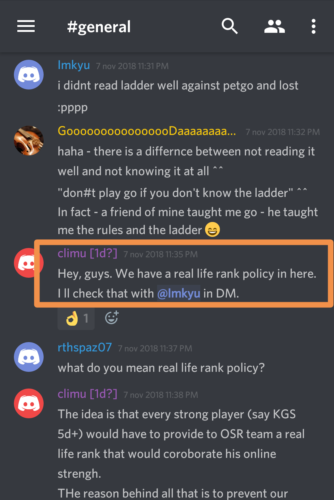 I would like to point out that it does not affect many players. We never had many very strong players in OSR as players as it's not a place where they can find competitive play or even training. It will always be a place where they can teach. We do have quite some of them as teachers and we appreciate their help a lot. We do know all real life identity of our teachers and their real life strength. All of them are quite known in the go world for participating in many real life tournaments.
